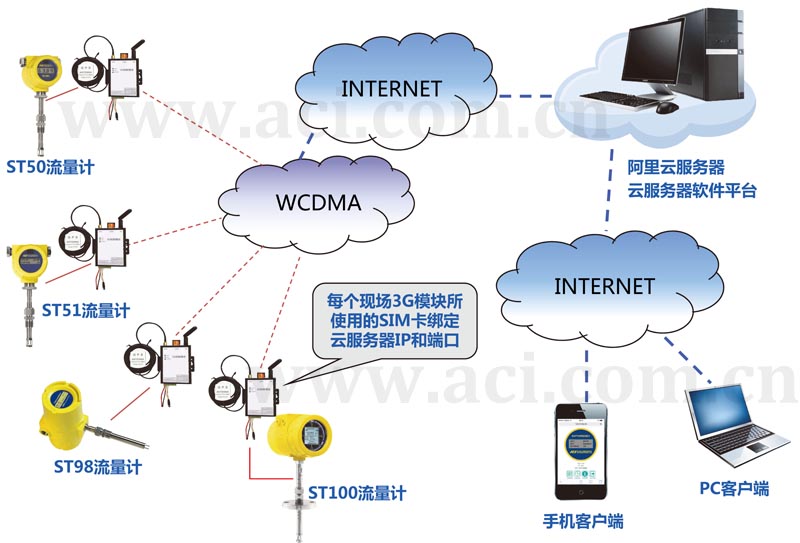 产品采用专利技术的3G数据终端模块,可以在不影响现有仪表(如FCI热式流量计)正常测量和使用安全性的前提下,将现场仪表与云服务器进行无线连接,用户通过手机(或PC)客户端即可实现对过程参数的读取及仪表的组态、诊断功能。