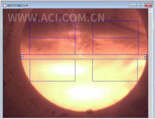 如下图所示,CANTY 分析软件中的配合料熔体边缘探测模块以黄色标注出玻璃配合料(原料)未熔化部分,直观地让用户看见系统探测结果,而底部红色区域则是完全熔化的玻璃熔体。同时,该模块还允许用户选择熔体边缘最前端位置或是边缘前端平均位置等作为输出。这套系统除了提供玻璃熔窑内部视野外,还能 提供多个用户指定位置的实时温度,以及工艺进程速度等信息。