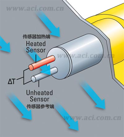 ST110流量计精确的流量传感器采用恒功率的热扩散原理,如图4所示,将两个带热套管保护的铂RTD温度传感器插入过程介质中。其中一个RTD带加热,另外一个则测量实际的过程温度。这两个RTD之间的温度差直接与介质的质量流量成比例。这种原理支持直接质量流量测量,并且无需额外的温度和压力传感器即可进行质量流量计量。