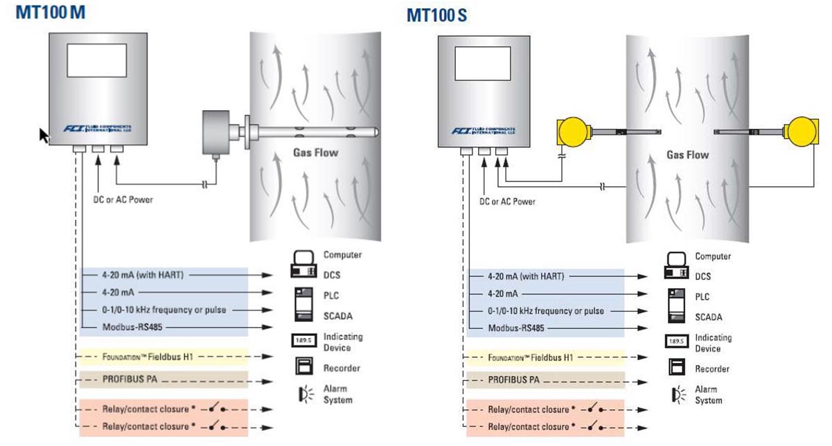 高温、潮湿和/或肮脏的气体伴随直管段不足、流场扰动、低流速和宽量程比要求等情 况,是众多流量测量技术常见的挑战。FCI 的 MT100 系列热式质量流量计可通过对2到8个流量传感点的测量解决这些问题,在管道同一截面的不同位置布置多个传感器,将多个传感器器的输出进行平均,从而得到管道内部的真实流量。