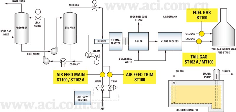 严格控制酸性气、废气和可用氧气(空气)之间的比例,对SRU的有效运行至关重要。SRU的空气供气系统,包括一条主送风管道和可调节流量的供气管道。为确保恰当的控制,供气系统所选择的空气流量计必须有足够快的响应时间,以保证实测流量值不会超过或低于工艺设定值。