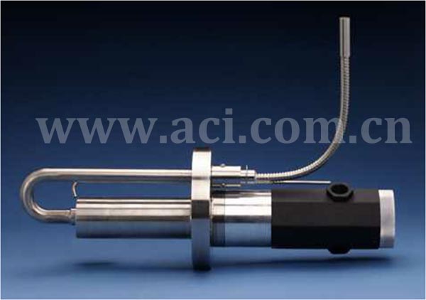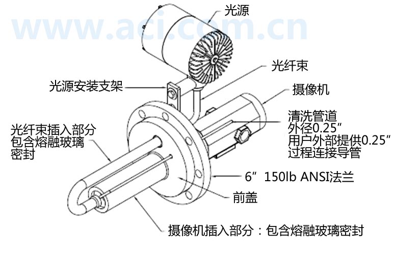 通过上图我们可以看到,光源系统固定在一个预先设计好的法兰上,通过插入的光纤束将光源导入容器内部并以180度回弯,与摄像机插入部分的顶端形成一个缝隙,处于缝隙置中的糖晶体图像被拍摄并通过预装了CantyVision图像分析软件的CANTY VCM控制模组进行实时监控和分析。熔融玻璃密封保证容器内部与法兰外部隔离。预留的清洗管道一端连接到用户配套的清洗管道上,另一端则处在镜头与光纤束头之间,方便对之进行清洗。