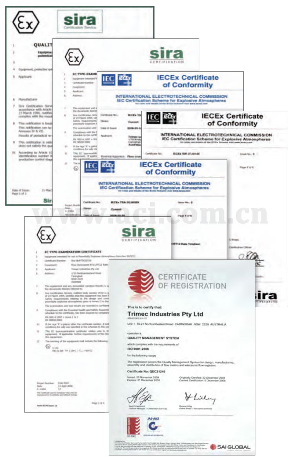 | 防火认证(Exd) IECEx. ATEX Exd IIB T6 (60℃) & T4 IP66 / IP67 椭圆齿轮和旋转活塞式容积流量计 本安认证(I.S.) IECEx. ATEX EEx ia IIB T4 (Tamb=60℃) IP66 / IP67 自供电和外部供电流量读数仪表,一体或远传安装。 CE & EMI / EMC认证 适用于所有Trimec产品。 PED压力指标 产品符合97/23/EC压力设备指标 RoHS WEEE 认证 所有电子产品符合针对监测和控制设备的RoHS & WEEE绿色规章指令。 澳大利亚NMI认证 Trimec中等和大容积椭圆齿轮流量计符合澳大利亚国家计量研究院认证 AS/NZS ISO 9001:2008质量体系认证 设计和制造质量管理体系通过认证 |